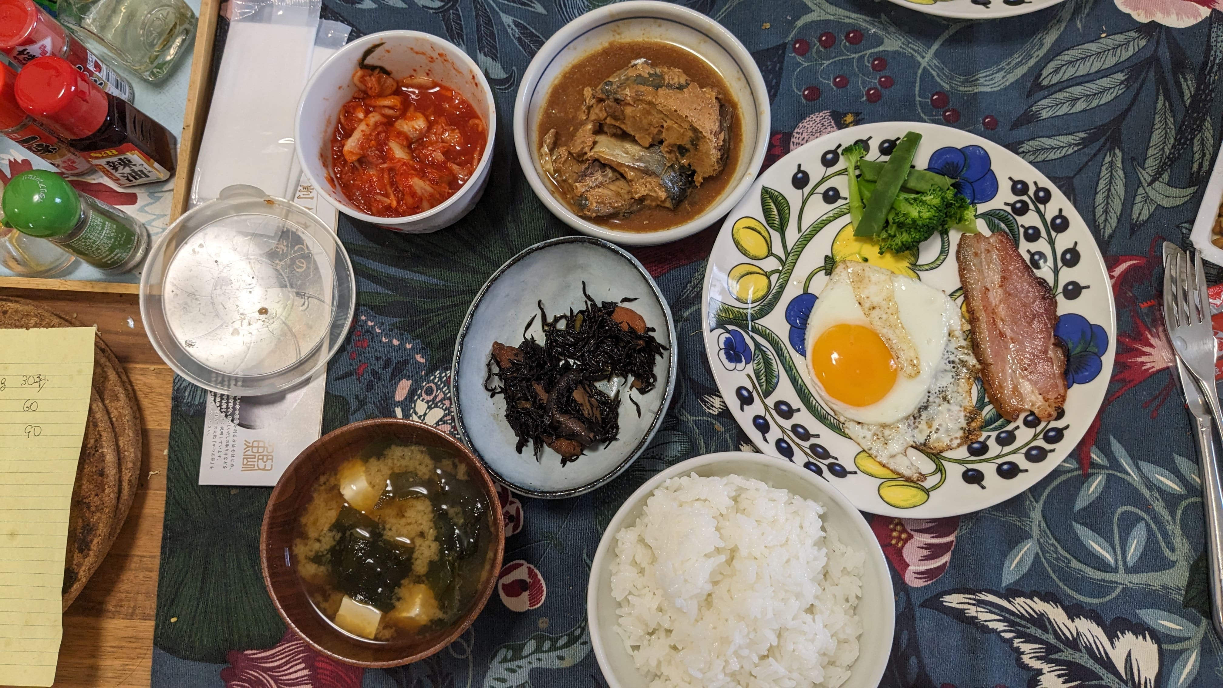 さば味噌煮缶、目玉焼き、ベーコン